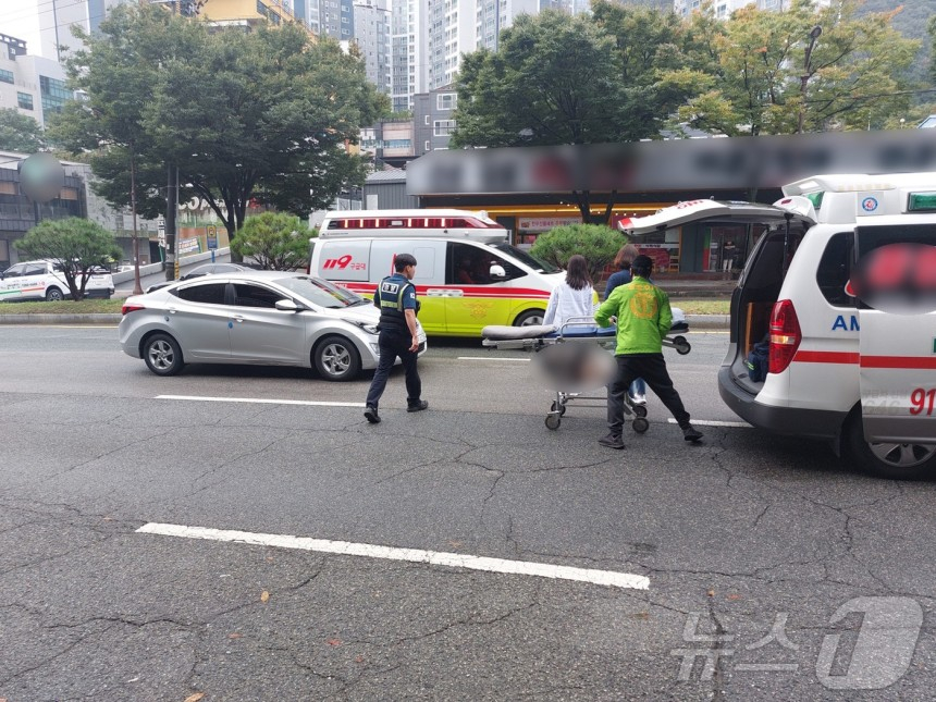 15일 김해에서 열린 전국체전 하프마라톤 경기에서 통제구간에 진입한 승용차가 경기 중인 선수를 뒤에서 들이 받아 부상을 입은 선수가 병원으로 이송되고 있다. /사진=뉴스1/독자 제공