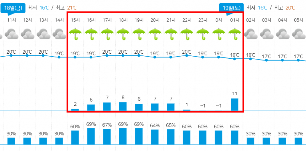 기상청에 따르면 잠실야구장이 위치한 서울 송파구 잠실동에는 18일 오후 3시부터 다음날인 19일 오전 1시까지 계속해서 비 예보가 내려져 있다. 강수량도 적지 않은 편이다. 경기가 열리기 직전인 오후 5시부터 경기가 막바지를 향할 오후 9시 사이에 시간당 6~8mm의 강수량이 예보돼 있다. 강수 확률은 60~70%. 예보가 맞는다면 경기는 정상적으로 개최되기 어려울 것으로 보인다. 팬들이 괜히 기다리지 않도록 상황에 따라서는 일찌감치 우천 취소 결정을 내릴 가능성도 있다.