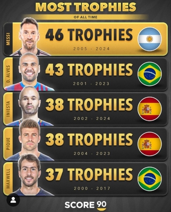 FC바르셀로나 시절 메시는 스페인 라리가와 유럽축구연맹(UEFA) 챔피언스리그(UCL), FIFA 클럽월드컵 등 숱한 트로피를 들어 올렸다. 미국 메이저리그사커(MLS)에 진출한 뒤에도 마이애미에 구단 사상 첫 우승을 안겼다. 역대 최고의 선수라 통하는 메시는 46개의 트로피를 석권했다.