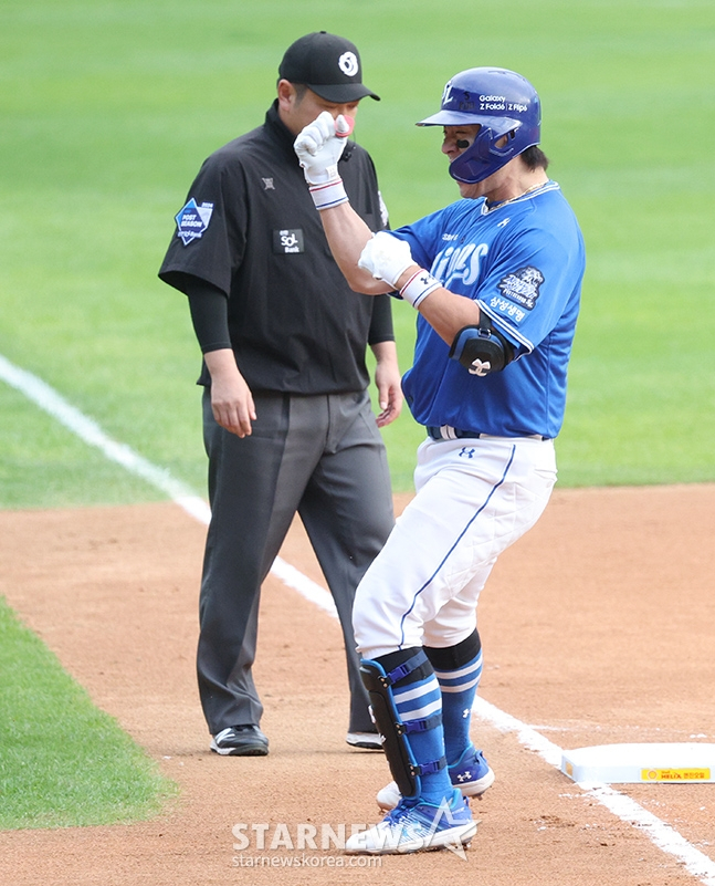 8회초 강민호가 기회를 살렸다. 3차전까지 타율 0.182(11타수 2안타)로 베테랑의 역할을 하지 못했던 강민호가 드디어 값진 한 방을 날렸다. LG의 두 번째 투수 손주영과 무사 주자 없는 상황에서 볼카운트 3-1에서 5구 시속 147㎞ 높게 제구된 속구를 강타, 좌중간을 넘기는 비거리 129m 선제 솔로 홈런을 터뜨렸다.