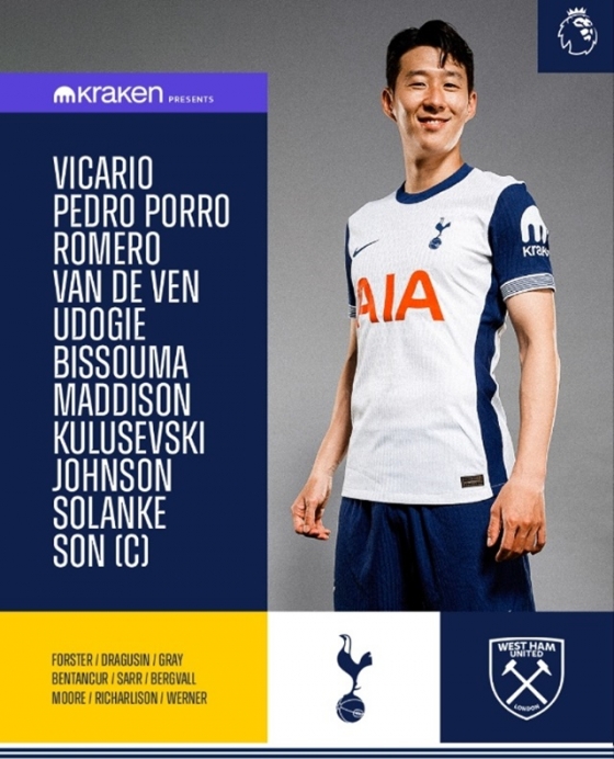 토트넘에 기분 좋은 소식이 있다. 에이스이자 팀 주장 손흥민이 부상에서 복귀해 선발로 출격한다. 이와 함께 도미닉 솔란케, 브레넌 존슨, 데얀 쿨루셉스키, 제임스 매디슨, 이브 비수마, 데스티니 우도기, 미키 반더벤, 크리스티안 로메로, 페드로 포로, 굴리엘모 비카리오가 선발 명단에 이름을 올렸다. 손흥민은 솔란케, 존슨과 함께 스리톱 호흡을 맞출 전망이다.