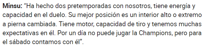 프리시즌에서 감독의 눈길을 끈 김민수는 지로나 1군 팀에서 경기까지 뛰게 됐다. 미켈 감독은 김민수를 직접 인터뷰에서 언급했다. 다음 경기 출전까지 예고하며 김민수를 향한 믿음을 강조하기도 했다.