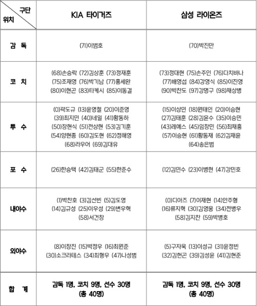 1차전을 하루 앞둔 20일 오후 두 팀의 한국시리즈 최종 30인 엔트리가 공개됐다. KIA는 투수진을 곽도규, 윤영철, 이준영, 최지민, 제임스 네일, 황동하, 장현식, 전상현, 김기훈, 양현종, 김도현, 정해영, 에릭 라우어, 김대유 등 14명으로 꾸렸다. 야수에서는 포수 한승택, 김태군, 한준수, 내야수는 박찬호, 김선빈, 김도영, 김규성, 이우성, 변우혁, 서건창, 외야수는 이창진, 박정우, 최원준, 소크라테스 브리토, 최형우, 나성범 등 총 16명이 승선했다.