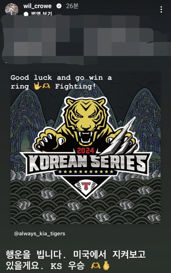 크로우는 KIA 선수들의 SNS를 최대한 많이 태그한 뒤 "행운을 빕니다. 미국에서 지켜보고 있을게요. KS 우승"이라는 응원과 함께 한국시리즈 엠블럼과 하트 이모티콘을 올렸다.