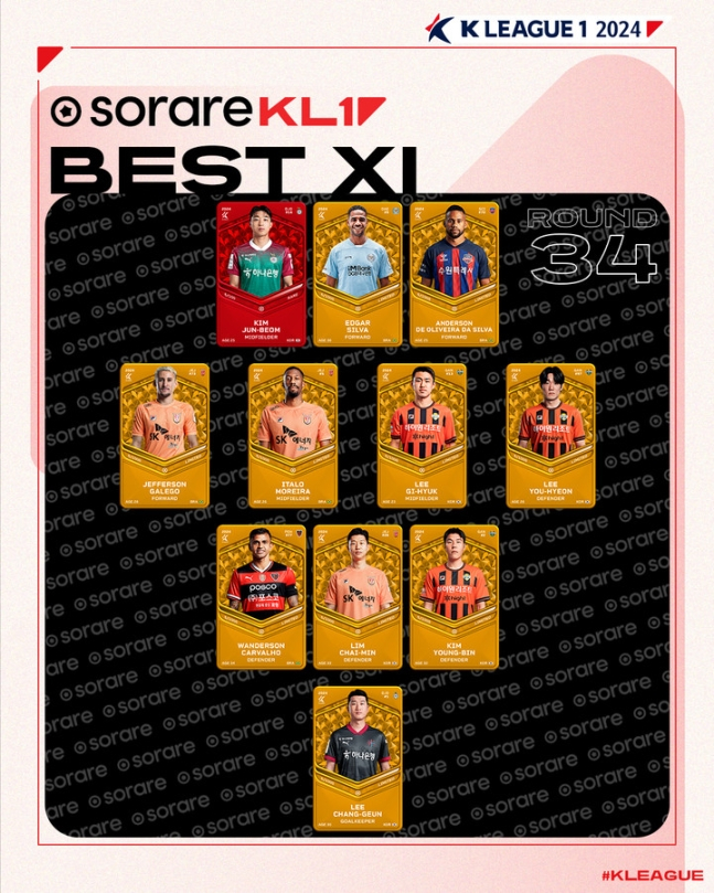 34라운드 베스트11에는 MVP 김준범을 비롯해 에드가(대구), 안데르손(수원FC), 갈레고, 이탈로(이상 제주), 이기혁, 이유현, 김영빈(이상 강원), 임창민(제주), 완델손(포항), 골키퍼 이창근(대전)이 이름을 올렸다.