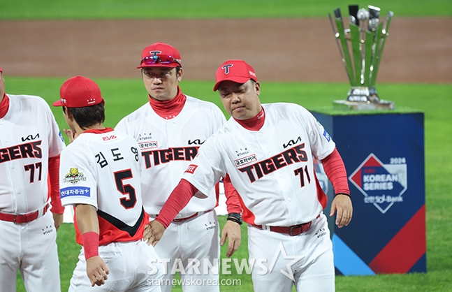 스포츠야구[포토] 이범호 '도영아, 트로피 봤능가'발행 : 2024.10.22 ・ 11:13광주=김진경 대기자'2024 KBO 포스트시즌 한국시리즈 1차전' KIA-삼성전이 21일 광주-기아챔피언스필드에서 열렸다.KIA 김도영이 개막 행사에 등장하며 이범호 감독을 비롯한 선수단과 하이파이브하고 있다.<저작권자 © 스타뉴스, 무단전재 및 재배포 금지>KBO한국시리즈코리안시리즈코시이범호김도영추천 기사김진경 대기자기자홈좋아요 스포츠-야구의 인기 급상승 뉴스스포츠-야구의 최신 뉴스