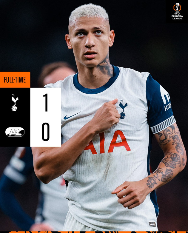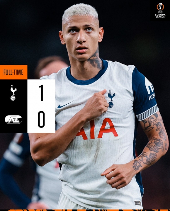 토트넘(잉글랜드)은 25일(한국시간) 영국 런던의 토트넘 핫스퍼 스타디움에서 열린 '2024~2025시즌 유럽축구연맹(UEFA) 유로파리그(UEL)' 리그 페이즈 3차전 홈 경기에서 AZ알크마르(네덜란드)에 1-0으로 승리했다.