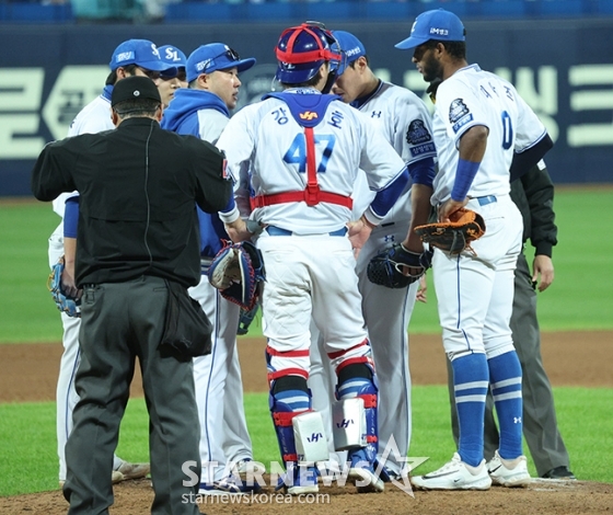 스포츠야구[포토] 박진만 감독 '절묘한 방문'발행 : 2024.10.25 ・ 22:11대구=김진경 대기자'2024 KBO 포스트시즌 한국시리즈 3차전' 삼성-KIA전이 25일 대구 삼성라이온즈파크에서 열렸다.삼성 김재윤이 9회초 흔들리는 모습을 보이자 박진만 감독이 마운드에 올라가 진정시키고 있다.<저작권자 © 스타뉴스, 무단전재 및 재배포 금지>한국시리즈이범호김도영김영웅네일원태인추천 기사김진경 대기자기자홈좋아요 스포츠-야구의 인기 급상승 뉴스스포츠-야구의 최신 뉴스
