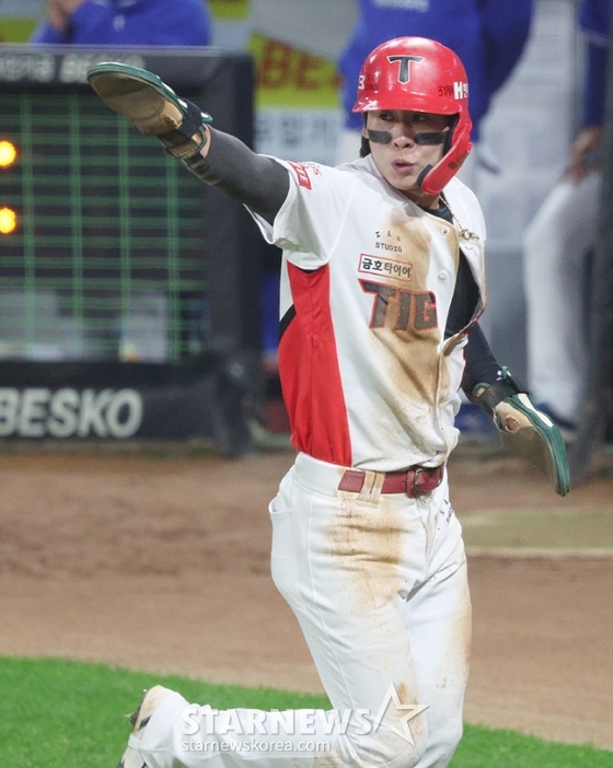 스포츠야구[포토] 박찬호 '추격하다보면...'발행 : 2024.10.28 ・ 19:44광주=김진경 대기자'2024 KBO 포스트시즌 한국시리즈 5차전' KIA-삼성전이 28일 광주-기아챔피언스필드에서 열렸다.KIA 1회말 1사 1,3루에서 1루주자 박찬호가 나성범의 희생 플라이 때 득점한 후 세리머니를 선보이고 있다.<저작권자 © 스타뉴스, 무단전재 및 재배포 금지>한국시리즈이범호김도영김영웅네일원태인추천 기사김진경 대기자기자홈좋아요 스포츠-야구의 인기 급상승 뉴스스포츠-야구의 최신 뉴스