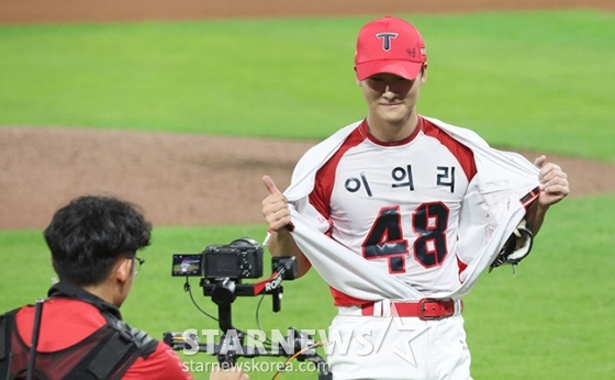KIA 곽도규가 6회 투구를 마친 후 '이의리 유니폼' 퍼포먼스를 선보이며 더그아웃으로 향하고 있다.