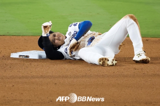 LA 다저스 오타니 쇼헤이가 27일(한국 시각) 미국 캘리포니아주 로스앤젤레스 다저스타디움에서 열린 뉴욕 양키스와 2024 미국 프로야구 메이저리그(MLB) 월드시리즈 2차전에서 7회 도루하다가 왼 어깨 부상을 당한 뒤 고통스러워하고 있다. /AFPBBNews=뉴스1