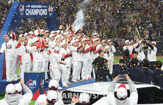 '2024 KBO 포스트시즌 한국시리즈 5차전' KIA-삼성전이 28일 광주-기아챔피언스필드에서 열렸다. KIA가 5차전 삼성에 승리히며 4승 1패로 우승을 차지했다. 이범호 감독이 우승 트로피를 들어올리고 있다. /사진=김진경 대기자