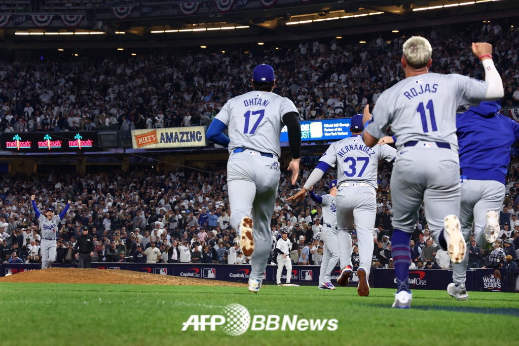 LA 다저스 선수들이 31일(한국 시각) 미국 뉴욕 브롱크스에 위치한 양키스타디움에서 열린 LA 다저스와 2024 미국 프로야구 메이저리그(MLB) 포스트시즌 월드시리즈 5차전에서 우승이 확정되자 기뻐하고 있다. /AFPBBNews=뉴스1