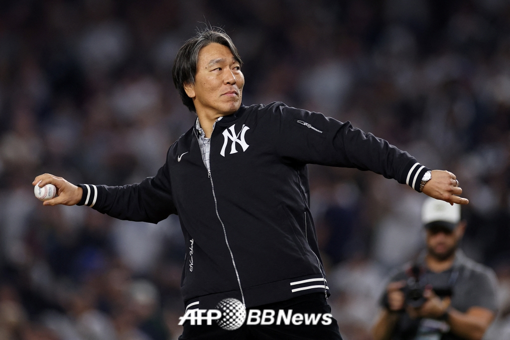 마쓰이 히데키가 31일(한국 시각) 미국 뉴욕 브롱크스에 위치한 양키스타디움에서 열린 LA 다저스와 2024 미국 프로야구 메이저리그(MLB) 포스트시즌 월드시리즈 5차전에 앞서 시구를 하고 있다. /AFPBBNews=뉴스1