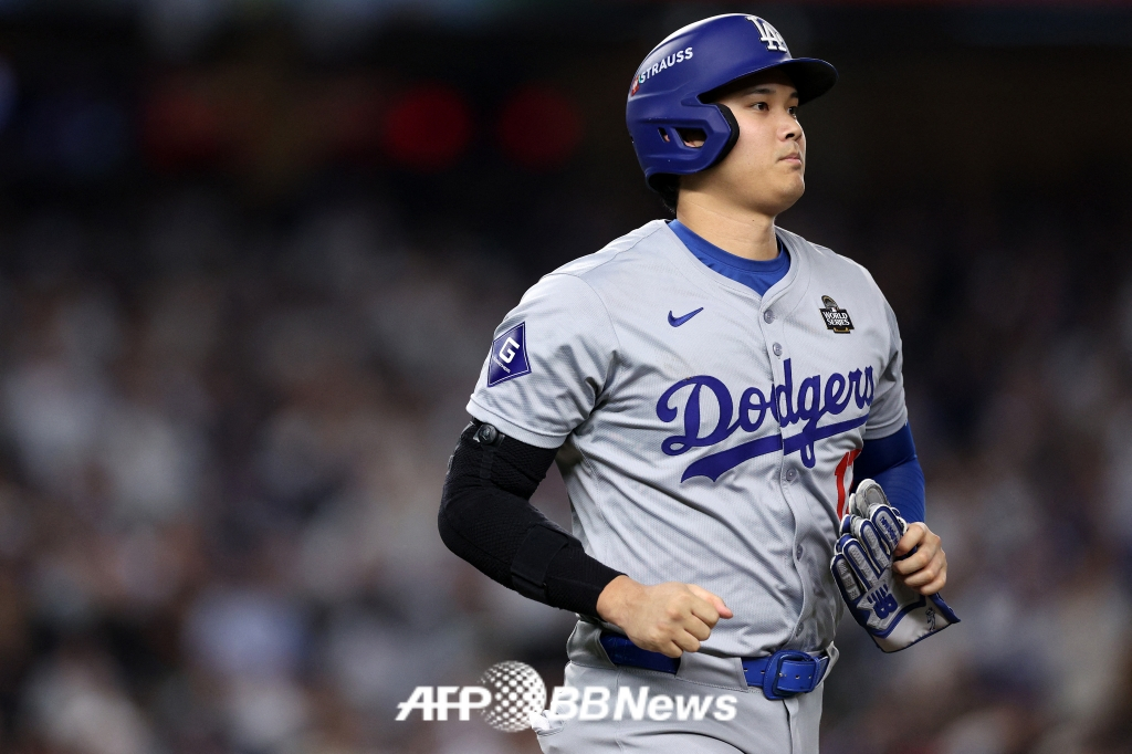 오타니 쇼헤이가 31일(한국 시각) 미국 뉴욕 브롱크스에 위치한 양키스타디움에서 열린 LA 다저스와 2024 미국 프로야구 메이저리그(MLB) 포스트시즌 월드시리즈 5차전에서 타격한 뒤 1루를 향해 뛰어가고 있다. /AFPBBNews=뉴스1