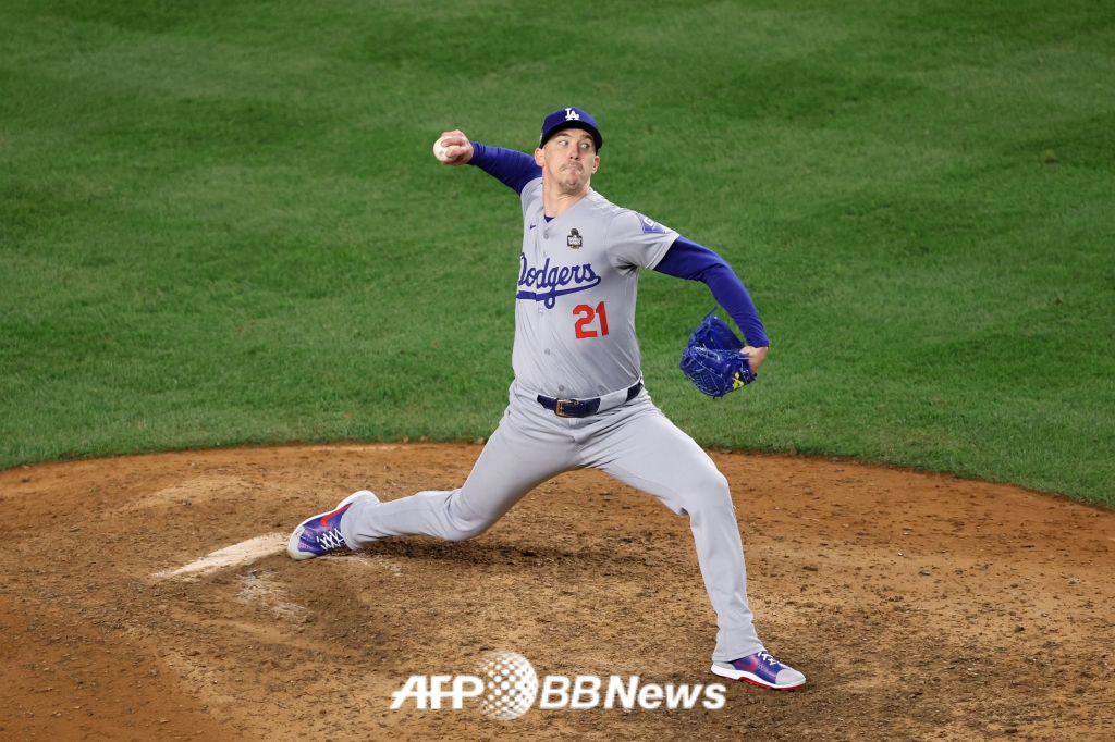 워커 뷸러가 31일(한국 시각) 미국 뉴욕 브롱크스에 위치한 양키스타디움에서 열린 LA 다저스와 2024 미국 프로야구 메이저리그(MLB) 포스트시즌 월드시리즈 5차전에서 9회 마운드에 올라 역투하고 있다. /AFPBBNews=뉴스1