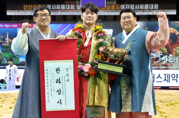 30일 경기도 안산시 와동체육관에서 열린 '위더스제약 2024 민속씨름 안산김홍도장사씨름대회 및 제4회 안산김홍도여자장사씨름대회' 한라장사(105kg이하) 결정전(5판3선승제)에서 박민교(용인특례시청)가 김무호(울주군청)를 상대로 3-1로 승리하며 황소트로피를 들어올렸다.