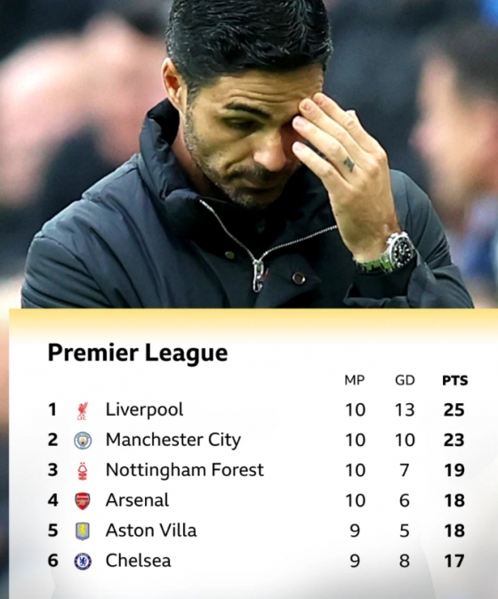 아스널은 최근 프리미어리그 세 경기에서 1무 2패를 거뒀다. 지난 20일 AFC본머스 원정 경기에서 0-2로 패한 데 이어 28일 리버풀과 홈 경기서 2-2로 비겼다. 뉴캐슬전 패배로 아스널은 노팅엄 포레스트(10경기 19점)에 3위를 내줬다.