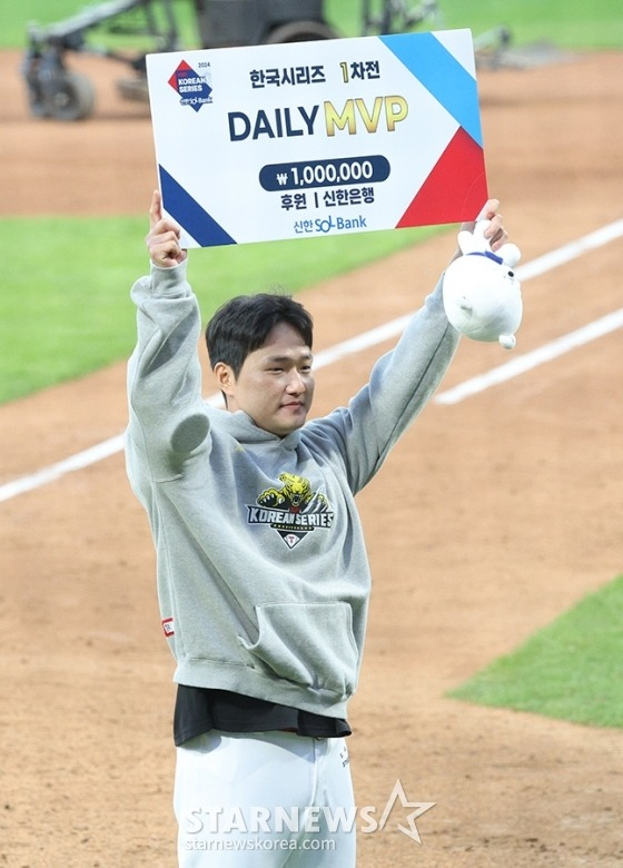 한국시리즈(KS) 1차전에서 박병호(38·삼성)를 삼진으로 잡은 전상현(28·KIA)의 공이 230만원에 팔렸다.
