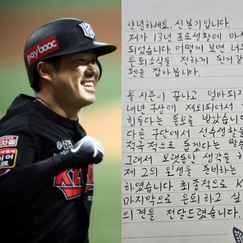 신본기는 12일 자신의 개인 SNS를 통해 "안녕하세요. 신본기입니다. 제가 13년 프로 생활에 마침표를 찍게 됐습니다"라는 문구로 시작하는 두 장짜리 자필 손편지를 공개했다.