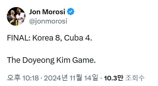 이날 김도영의 대활약을 주목한 건 한국만이 아니다. 이번 프리미어12 해설을 위해 대만을 찾은 MLB 네트워크의 존 모로시는 이날 경기를 평가하면서 "김도영 게임(The Doyeong Kim Game)"이라는 말을 남겼다. 그야말로 김도영의 원맨쇼라는 뜻이었다. 그는 "김도영이 만루홈런과 2루타, 3루에서 두 차례 뛰어난 수비로 장타를 막아냈다"며 "오늘 밤 세계적인 스타로 등극했다"고 말했다.
