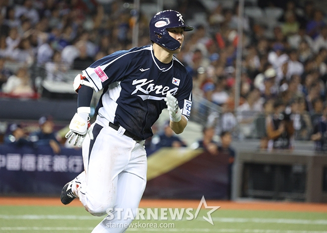 하지만 한국은 1회 초부터 찬스를 만들었다. 앞선 2경기에서 안타가 없던 선두타자 홍창기가 좌익수 옆에 떨어지는 안타로 출루에 성공했다. 이어 신민재의 희생번트로 1사 2루 득점권 기회가 만들어졌다.