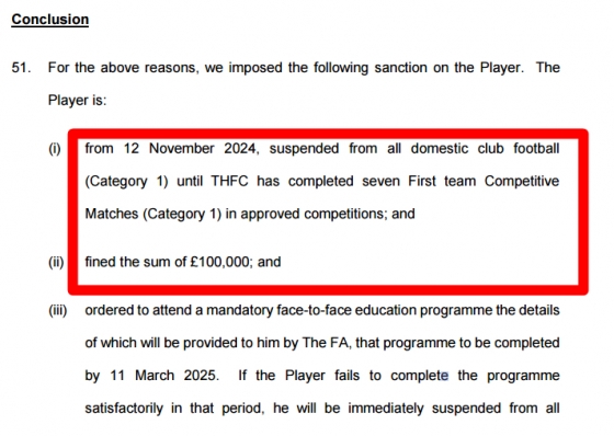 FA는 18일(한국시간) 공식 홈페이지를 통해 벤탄쿠르의 징계 내역을 공개했다. 협회는 "독립 규제 위원회는 언론 인터뷰에서 FA규정 E3을 위반한 벤탄쿠르에 7경기 출전 정지와 10만 파운드(약 1억 7000만 원)의 벌금을 부과했다"고 밝혔다.