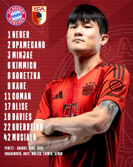 홈팀 뮌헨은 경기 내내 아우크스부르크를 압도했다. 4-2-3-1 포메이션을 가동해 경기장을 넓게 썼다. 케인이 원톱에 서고 킹슬리 코망, 자말 무시알라, 마이클 올리세가 뒤를 받쳤다. 레온 고레츠카와 키미히가 중앙 미드필더를 맡았다. 알폰소 데이비스, 김민재, 다요 우파메카노, 하파엘 게헤이루와 포백을 지켰다. 골문은 마누엘 노이어가 꼈다.