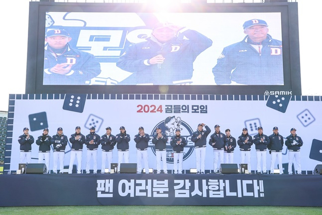 이어 새로운 주장 양의지(37)가 팬들에게 인사하는 자리를 가졌다. "올해 많은 책임감을 느낀다"며 2024시즌 주장 양석환에게 박수를 보내달라고 요청했다. "김재호 선수가 은퇴하며 최고참이 됐는데 열심히 해보겠다. 팬들이 원하시는 건 승리이니 더 많은 승리와 더 좋은 성적으로 곰들의 모임에서 만나 뵙고 싶다. 열심히 하겠다"고 말했다.
