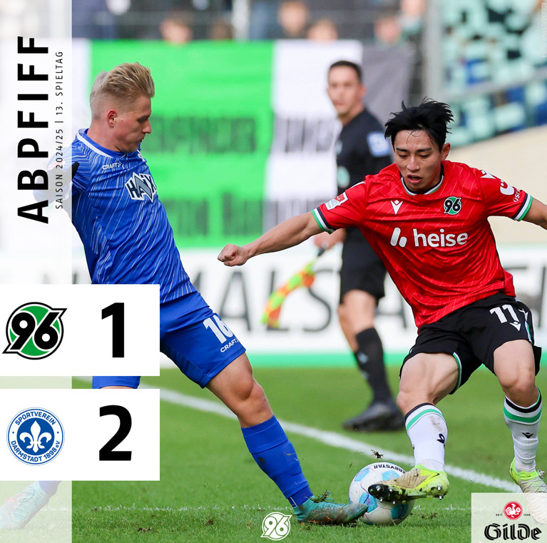 하노버는 24일(한국시각) 독일 하노버의 하인츠 본 하이덴 아레나에서 열린 다름슈타트와의 '2024~2025시즌 독일 2. 분데스리가(2부)' 13라운드 홈 경기에서 1-2로 패했다.