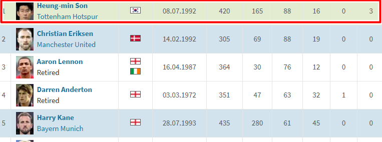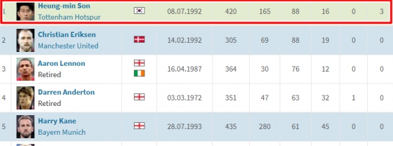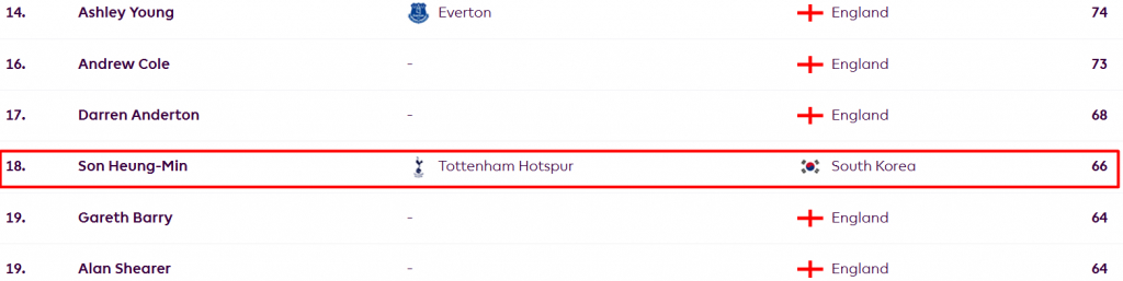 프리미어리그 역대 순위도 점점 오르고 있다. 이미 전설적인 이름들과 어깨를 나란히 한 지 오래다. 프리미어리그 통산 66도움을 기록한 손흥민은 가레스 배리와 앨런 시어러(이상 64회를 넘었고, 17위 대런 앤더튼(68회)를 맹추격하고 있다.