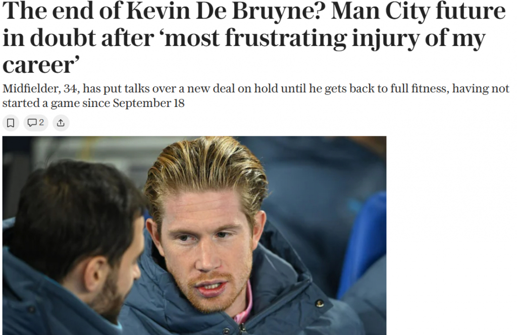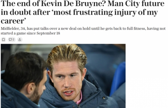 같은 날 영국 '텔레그래프'도 "더 브라위너의 맨시티 커리어가 끝나는 것인가. 경력 중 가장 실망스러운 부상 이후 맨시티에서 미래가 불투명하다"며 "더 브라위너도 맨시티에서 어떻게 될지 확신할 수 없다고 인정했다. 그는 회복에 집중하는 동안 미래를 결정하길 꺼렸다"고 알렸다.