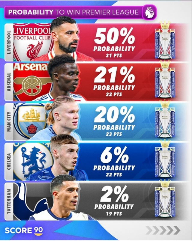 축구전문 스코어90은 지난 25일(한국시간) 유럽 5대리그 별로 우승 확률을 소개했다. EPL의 경우 리버풀이 우승확률 50%를 기록, 정상에 설 것이라고 내다봤다. 올 시즌 아르네 슬롯 신임 감독 체제를 알린 리버풀은 현재 리그 선두를 달리고 있다. 10승1무1패(승점 31)를 기록 중이다.