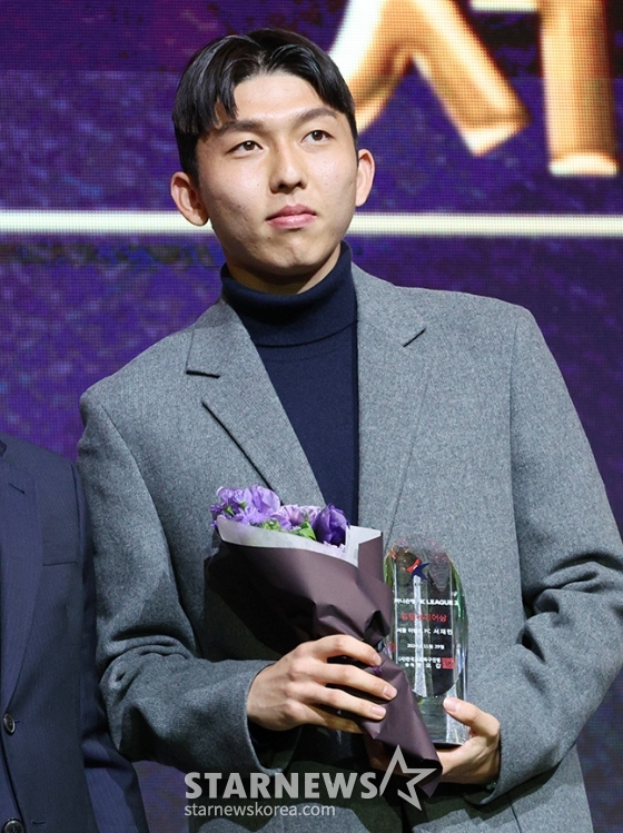 서재민(서울이랜드FC)이 K리그2 영플레이어상을 수상한 후 포토타임을 갖고 있다.