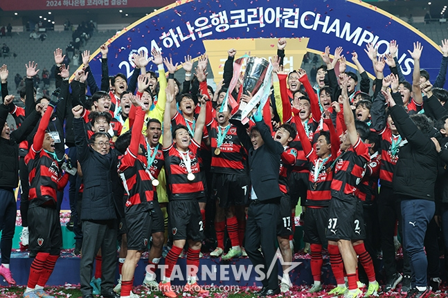 포항은 30일 서울월드컵경기장에서 열린 2024 하나은행 코리아컵 결승전 울산 HD와 맞대결에서 3-1로 역전승, 지난 해 우승에 이어 다시 한 번 코리아컵 정상에 올랐다. 또 포항은 코리아컵 최다 우승 6회 금자탑도 쌓았다. 이날 포항은 선제골을 허용했으나 정재희가 동점골, 연장에선 김인성이 결승골을 뽑아내 짜릿한 역전극을 만들었다. 연장 후반 막판에는 강현제가 쐐기골을 뽑아냈다.