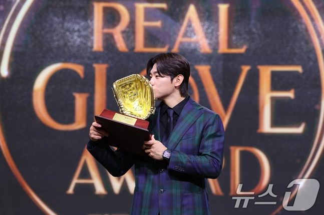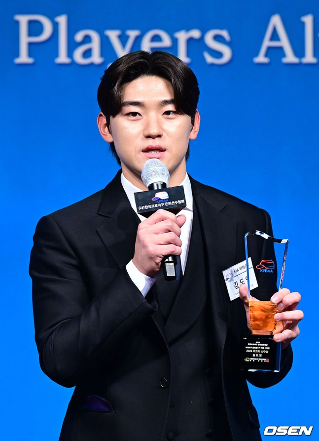 리얼글러브 어워드에서 올해의 선수상을 수상하기 위해 무대에 오른 김도영은 "야구 인기가 좋아진 해에 이 상을 받아 더욱 영광스럽다"며 "올해 성적에 안주하지 않고 매년 더 더욱 발전하는 모습을 보여주겠다"고 다짐했다.
