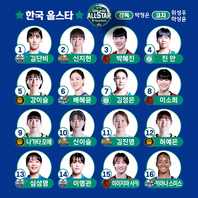 올스타에 선정된 16명의 선수들은 한국 올스타 소속으로 일본 W리그 소속의 일본 올스타와 맞붙는다. 한국 올스타의 코칭스태프는 2라운드 종료일(11월 30일) 기준 1위팀 BNK 썸 박정은 감독이 지휘봉을 잡고, 2, 3위팀 우리은행 위성우 감독과 삼성생명 하상윤 감독이 코치진으로 합류한다.