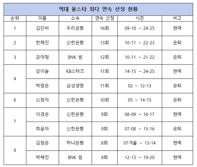 김단비는 총 2만 288표를 얻어 2위인 신한은행 신지현(1만 9895표)에게 393표 차로 앞섰다. 2013~2014시즌 첫 1위 이후 올 시즌을 포함해 역대 최다 1위 기록(8회)과 함께 2009~2010시즌 이후 16회 연속 올스타에 선정돼 이 부문에서도 최다 기록을 이어갔다.