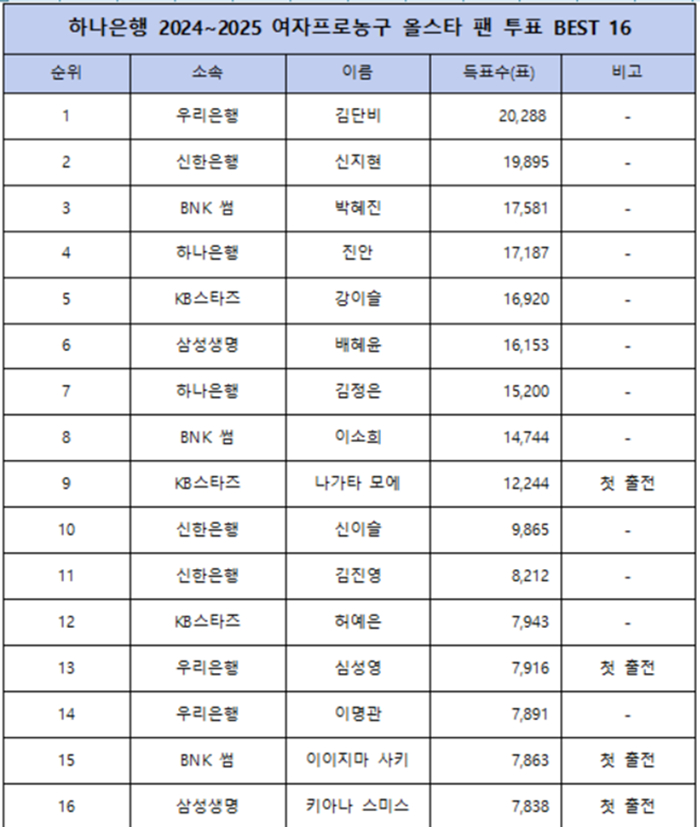 WKBL(한국여자농구연맹)은 지난 11월 21일부터 12월 2일까지 진행한 하나은행 2024~2025 여자프로농구 올스타 팬 투표에서 김단비가 전체 1위를 기록했다고 3일 발표했다.