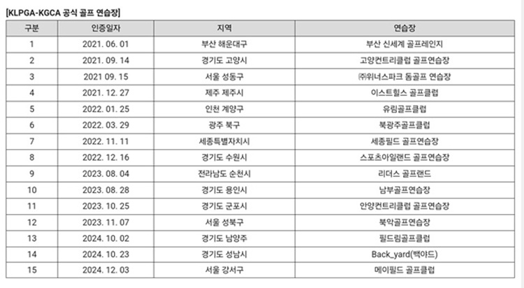 앞서 KLPGA는 2021년 '부산 신세계 골프레인지'를 시작으로 전국 14곳의 골프 연습장을 'KLPGA-KGCA 공식 골프 연습장'으로 인증했다. 지난 10월에는 남양주의 '필드림 골프클럽'과 성남의 쇼트게임 전문 연습장 'Back_yard(백야드)'를 각각 13호와 14호로 지정했다.