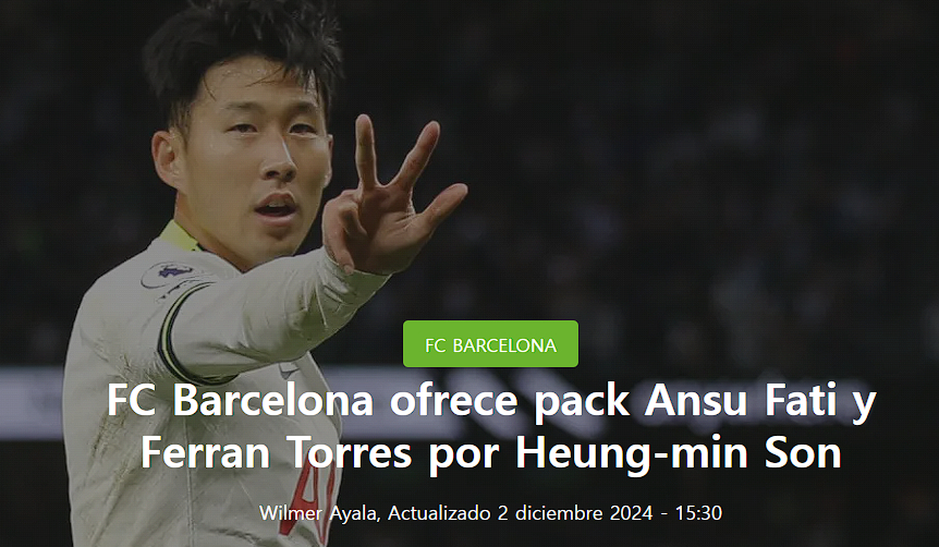 일단 바르셀로나는 손흥민을 공짜로 영입하려는 듯하다. 막대한 주급 지출이 확정적이라 봤다. '엘골디히탈'은 "손흥민이 바르셀로나에 자유계약선수(FA)로 도착해도 문제가 있다. 현재 손흥민은 시즌당 1200만 유로(약 178억 원)를 받고 있다"며 "따라서 데쿠 디렉터는 바르셀로나 공격수 안수 파티(22)와 페란 토레스(24) 매각을 고려 중이다. 두 선수 모두 2025년에 바르셀로나를 떠날 예정이다"라고 밝혔다.