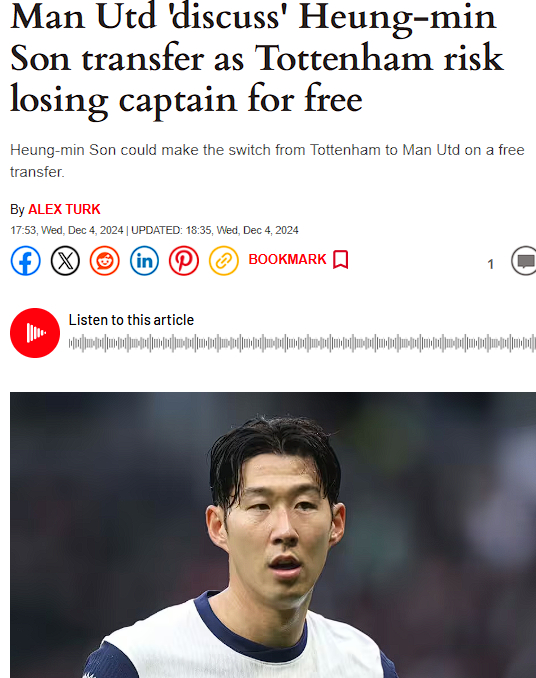 영국 매체 '익스프레스'는 5일(한국시간) "맨유는 손흥민 영입을 논의하고 있다. 내년 여름에 움직일 것이다. 토트넘 주장 손흥민은 이번 시즌이 끝나면 계약이 만료된다. 맨유의 영입 목표로 지목된 것으로 전해졌다"고 보도했다.