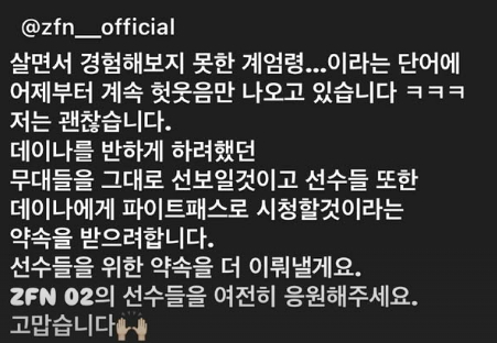 정찬성은 자신의 SNS에 "살면서 경험해보지 못한 계엄령... 이라는 단어에 어제부터 계속 헛웃음만 나오고 있다. 저는 괜찮다. 데이나를 반하게 하려고 했던 무대들을 그대로 선보일 것이고 선수들 또한 데이나에게 파이트패스(UFC의 자체 OTT)로 시청할 것이라는 약속을 받으려 한다"며 "선수들을 위한 약속을 더 이뤄내겠다. ZFN 02 선수들을 여전히 응원해달라"고 당부했다.