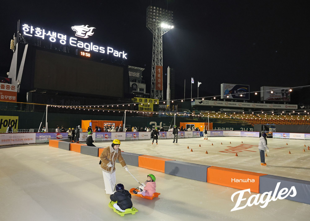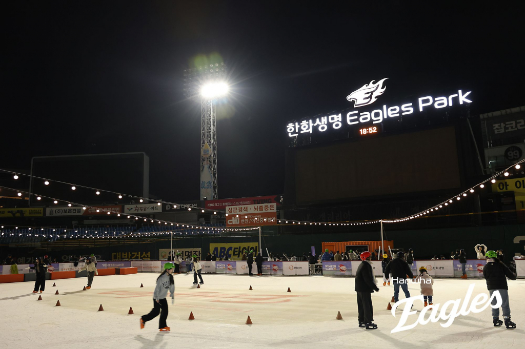 한화는 지난달 29일부터 3일까지 닷새 동안 한화생명 이글스파크 외야에 아이스링크를 설치해 팬들이 스케이트를 즐기며 추억을 쌓을 수 있는 '윈터랜드; 아듀! 이글스파크'를 진행했다.