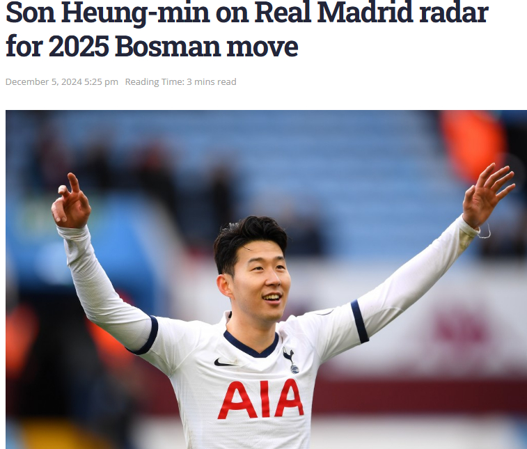 스포츠 전문 매체 '더 하드 태클'은 6일(한국시간) "손흥민은 최근 토트넘을 떠날 것이라는 소문에 휩싸였다"며 "스페인 소식통에 따르면 손흥민은 레알 마드리드의 영입 목표다. 스페인 라리가 챔피언인 레알 마드리드는 10년 전 토트넘에 합류한 손흥민을 보스만 룰을 활용해 영입하길 원한다"고 보도했다.