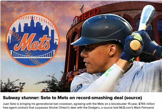 메이저리그 공식 홈페이지 MLB.com과 ESPN, 뉴욕 포스트, 저명 기자 제프 파산 등은 9일(한국 시각) 일제히 "슈퍼스타 외야수 후안 소토가 뉴욕 메츠와 15년 총액 7억 6500만 달러(한화 약 1조 980억원)에 계약했다. 이 계약은 프로스포츠 역사상 최고 규모"라고 전했다.