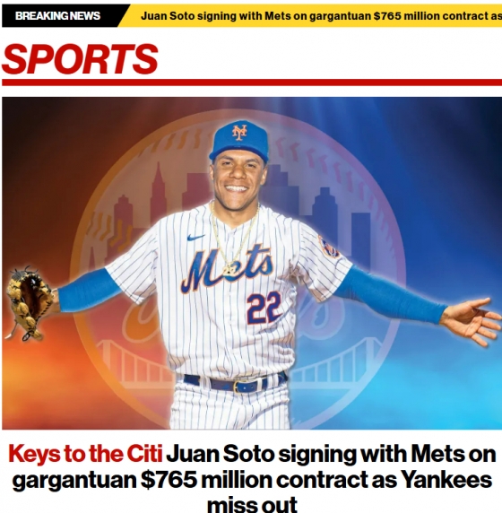 뉴욕 양키스 역시 소토 잔류에 최선을 다했으나, 결국 메츠가 영입전에서 승리한 것으로 전해졌다. 헤이먼은 "양키스가 소토에게 16년 7억 6000만 달러(1조 912억원)를 제시했다"고 했다. 메츠보다 계약 기간은 1년 더 길면서, 오히려 총액에서는 500만 달러가 적었다.