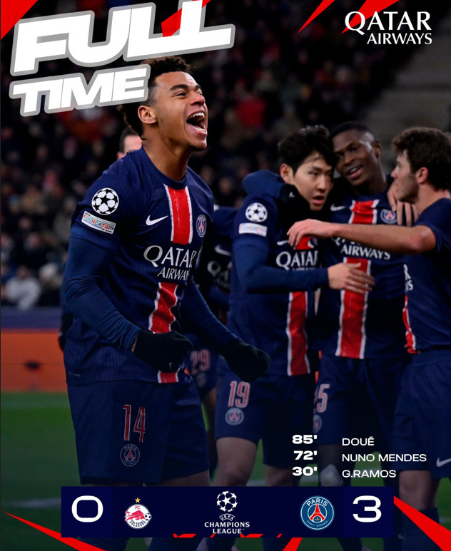 PSG는 11일(한국시간) 오스트리아 잘츠부르크의 레드불 아레나에서 열린 '2024-2025시즌 유럽축구연맹(UEFA) 챔피언스리그(UCL)' 리그 페이즈 6차전 원정에서 RB 잘츠부르크를 3-0으로 꺾었다.