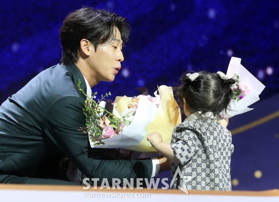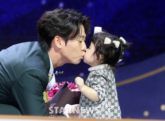 KIA 박찬호가 13일 오후 서울 강남구 삼성동 코엑스 오디토리움에서 진행된 '2024 신한은행 SOL 뱅크 KOB 골든글러브 시상식'에서 유격수 부문 골든글러브를 수상한 뒤 딸과 뽀뽀를 하고 있다. 2024.12.13