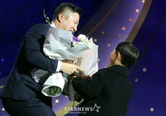 KIA 최형우(왼쪽)가 13일 오후 서울 강남구 삼성동 코엑스 오디토리움에서 진행된 '2024 신한은행 SOL 뱅크 KOB 골든글러브 시상식'에서 지명타자 부문 골든글러브를 수상한 뒤 아들에게 꽃다발을 받고 있다. /사진=김창현 기자